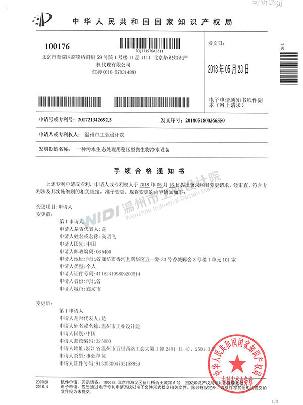 一種污水生態(tài)處理用穩(wěn)壓型微生物凈水設(shè)備手續(xù)合格通知書 (2)