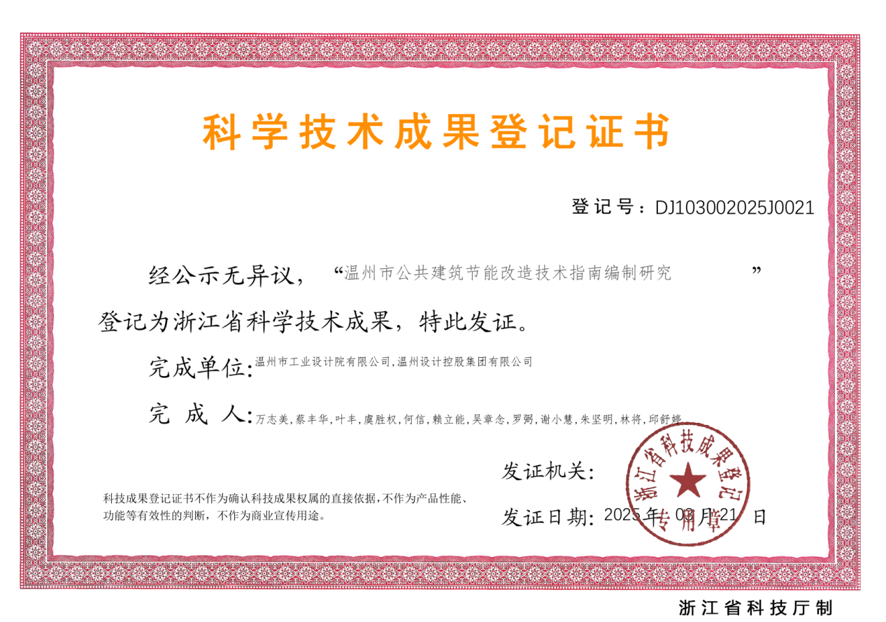 近日,工业院完成的《温州市公共建筑节能改造技术指南编制研究》课题,成功获得浙江省科学技术成果登记证书。这一成果充分彰显了公司在建筑节能领域的专业实力与创新能力,为助力“双碳”目标实现贡献了科技力量。...