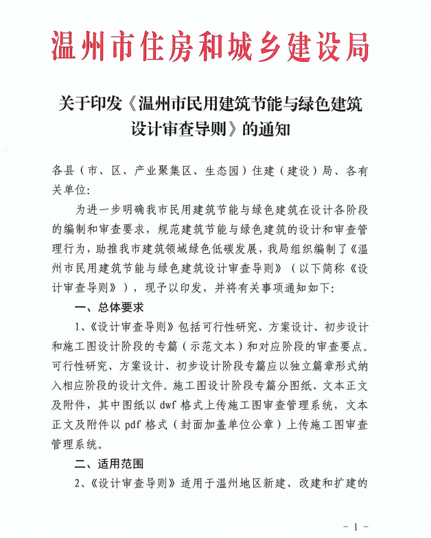 2022年7月15日,溫州市住房和城鄉(xiāng)建設(shè)局印發(fā)由工業(yè)院負(fù)責(zé)編制的《溫州市民用建筑節(jié)能與綠色建筑設(shè)計(jì)審查導(dǎo)則》,并將從8月15日起施行,標(biāo)志著溫州市綠色建筑設(shè)計(jì)進(jìn)入新的階段。